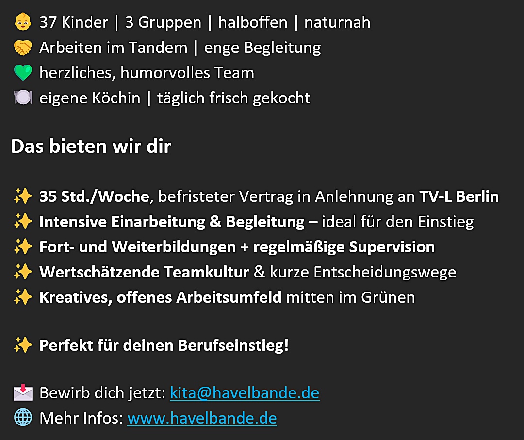 Du bist Berufsanfänger*in und suchst einen liebevollen Ort, um ins Berufsleben zu starten? Dann komm zu uns in die Elterninitiativ-Kita Havelbande in Berlin-Gatow!